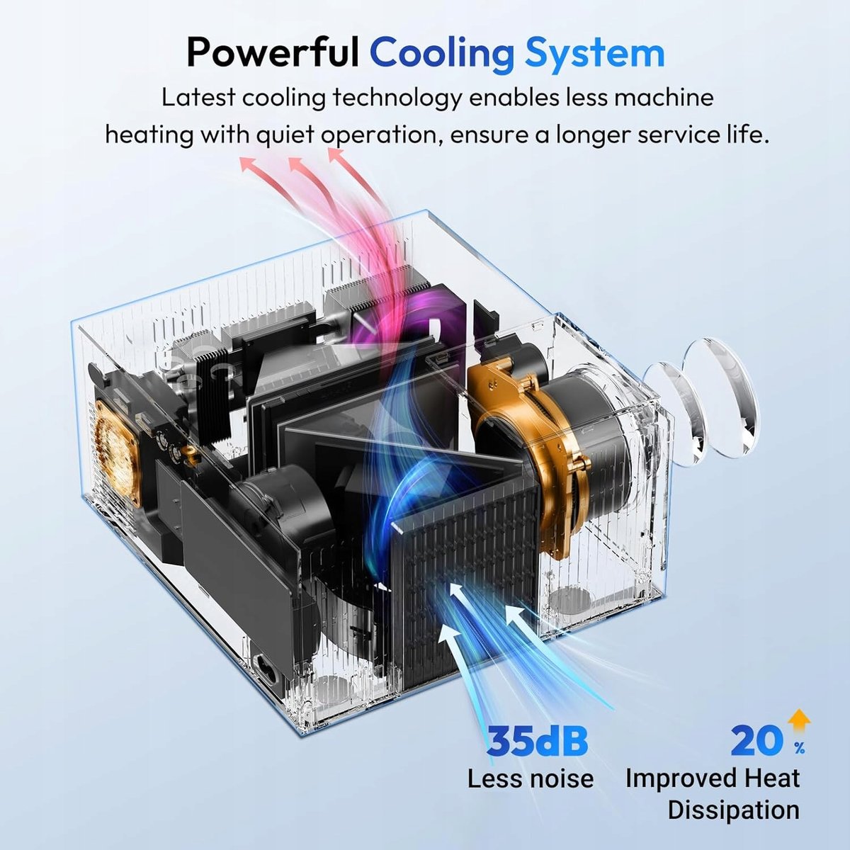 - System chłodzenia z podwójnym wentylatorem i technologią redukcji hałasu (<35 dB) zapewnia cichą pracę.