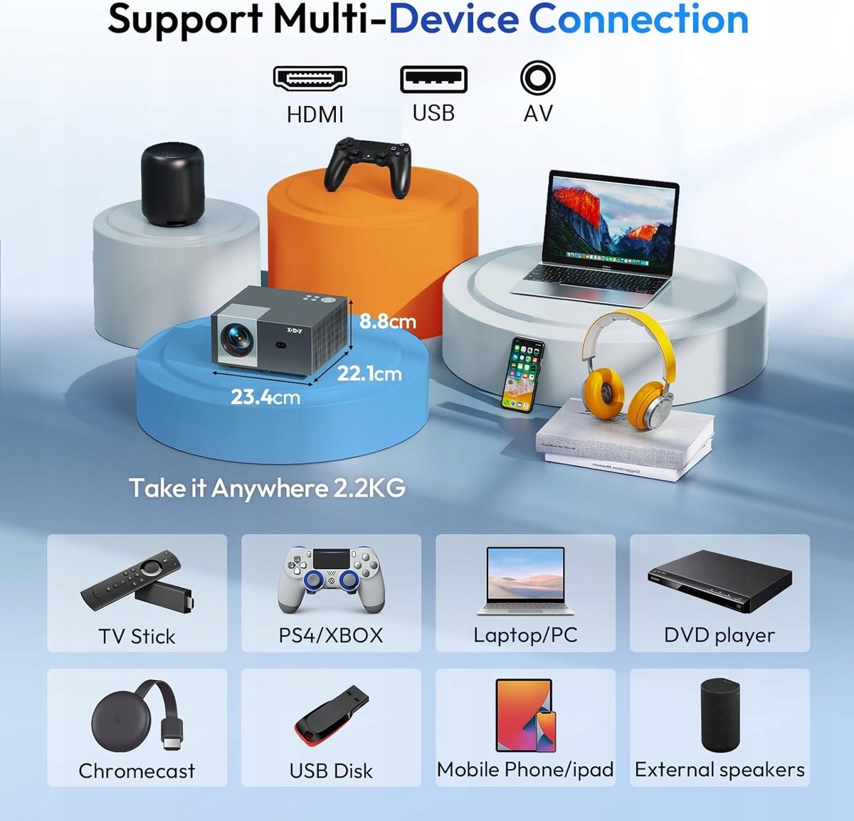 - Dwukierunkowe połączenie Bluetooth 5.2 umożliwia użycie projektora jako głośnika Bluetooth lub połączenie z zewnętrznymi urządzeniami audio.