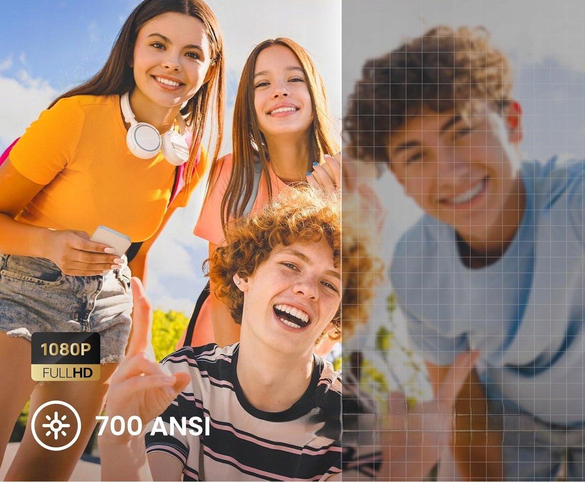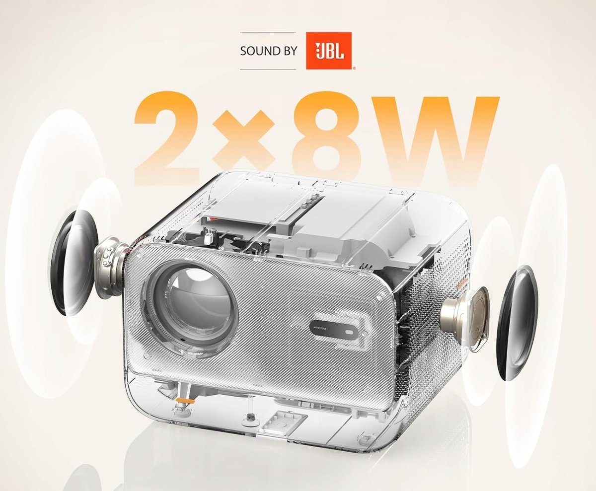 - Funkcja specjalna: ① Dźwięk zapewniany przez JBL②1S Bezproblemowy autofokus/Automatyczna korekcja trapezowa w górę i w dół③700 ANSI i natywny 1080P④50%-100% Zoom⑥WiFi6 i Bluetooth