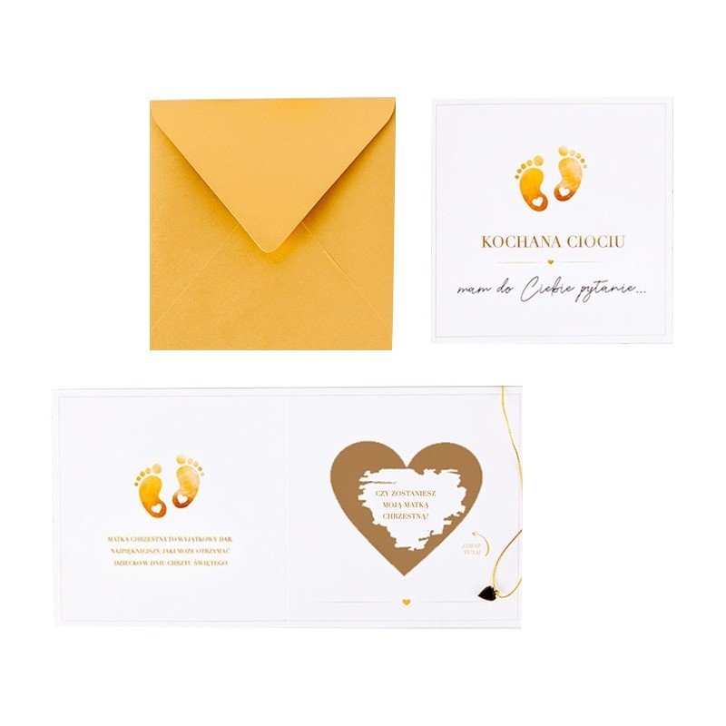 Piękna zdrapka z motywem złotych stópek to wspaniały pomysł, aby poprosić najbliższą osobę o zostanie Matką Chrzestną Maleństwa. Prośba wykonana została z dbałością o najmniejszy szczegół, z wyjątkową grafiką, uroczym wierszykiem oraz zdrapką w kształcie serca.