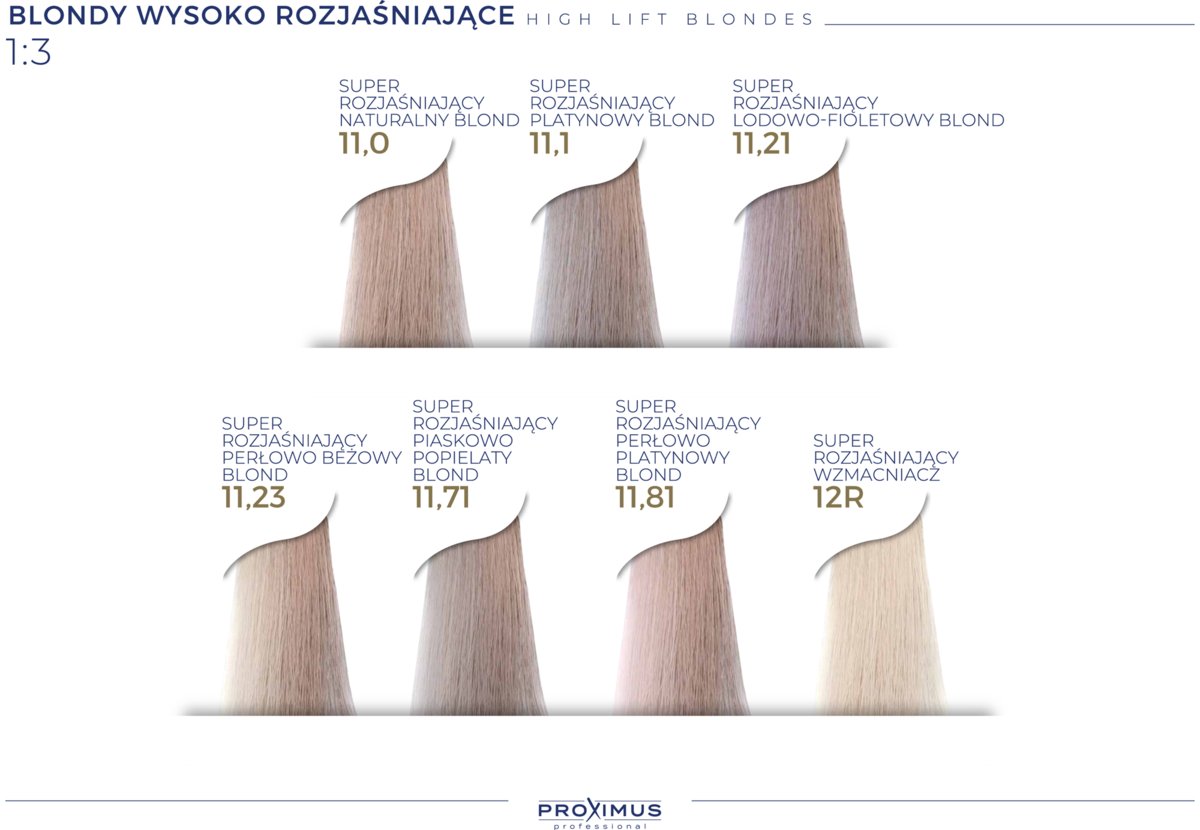 Farby PSC mieszamy z emulsjami utleniającymi Proximus Cream Developer w proporcji 1:2 (kolory super rozjaśniające mieszamy w stosunku 1:3). Farba w 100% pokrywa włosy siwe a wybrane kolory posiadają możliwość rozjaśnienia włosów o ponad 5 tonów.