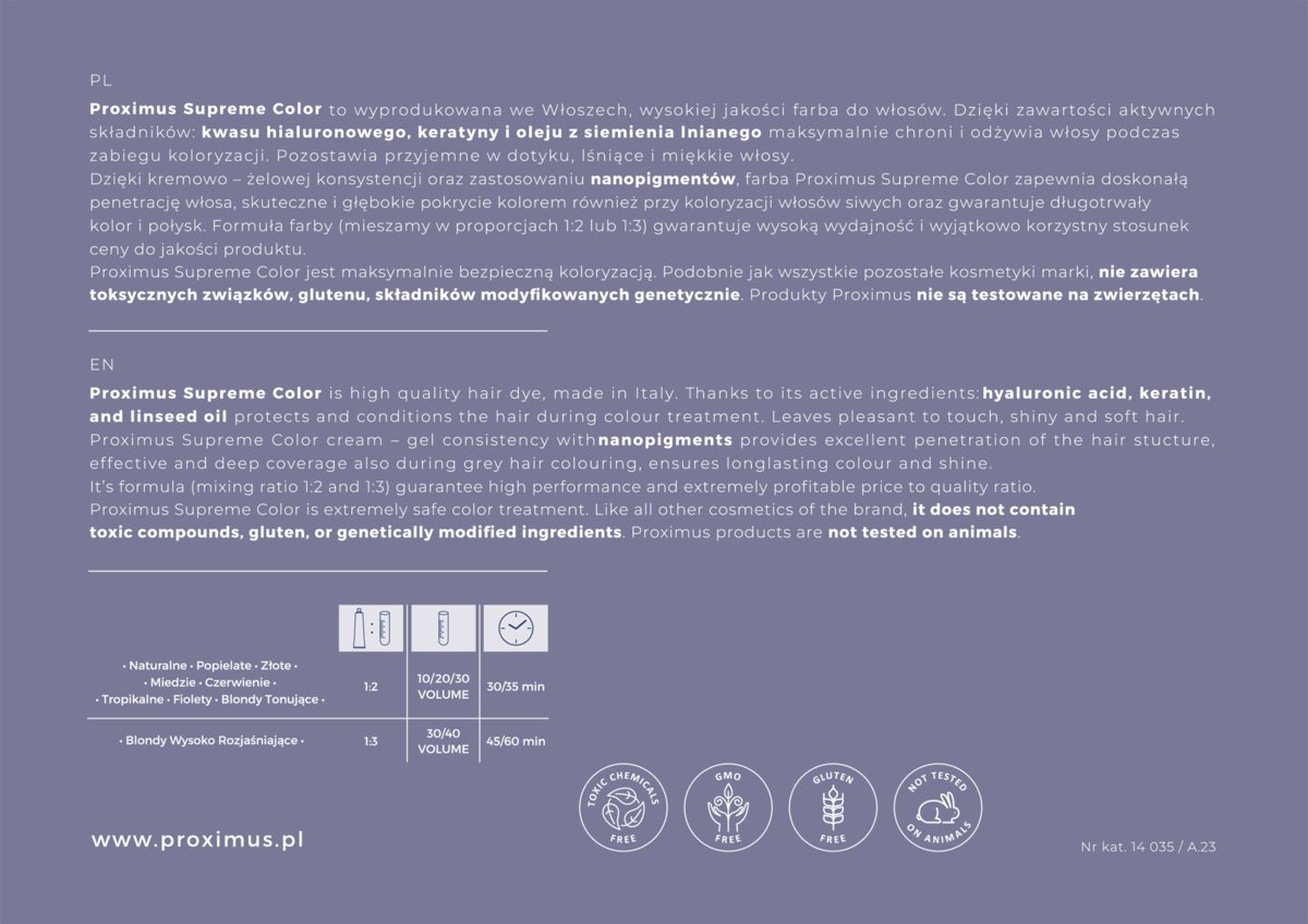 Farba do włosów Proximus Supreme Color Nanotechnology stanowi przełom w ofercie marki. Gwarantuje ona nową jakość nanokoloryzacji za wyjątkowo korzystną cenę. Formuła farby została udoskonolona z myślą o włosach coraz częściej narażonych na silne szkodliwe działanie czynników zewnętrznych i cywilizacyjnych.