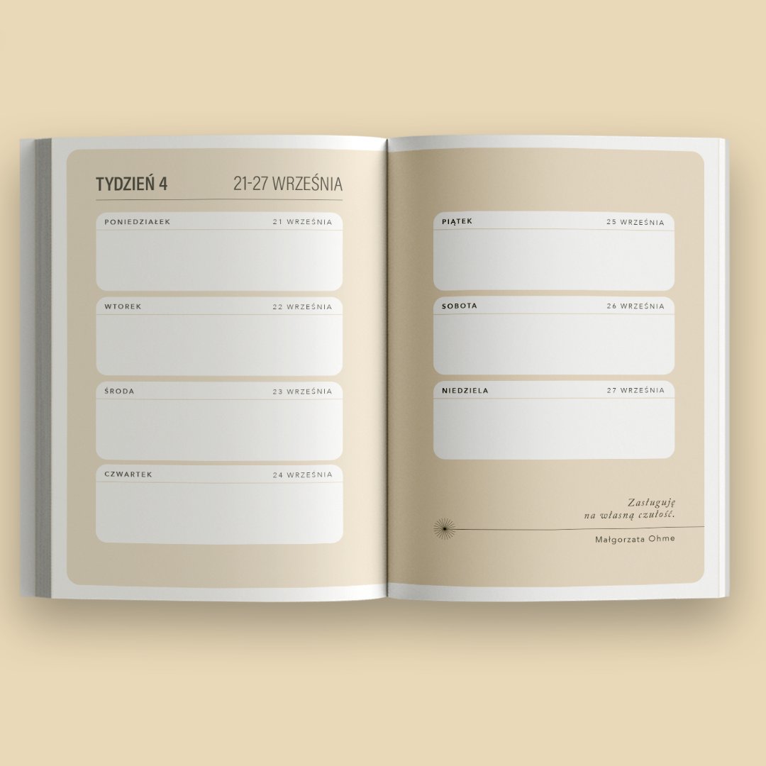 Dziennik motywacyjny Gosi Ohme to twoja osobista mapa wędrówki ku przebudzeniu. Znajdziesz tu nie tylko kalendarz, afirmacje i inspirujące cytaty, ale również ćwiczenia, które pomogą ci odkryć, jak żyć w świadomy, uważny sposób.