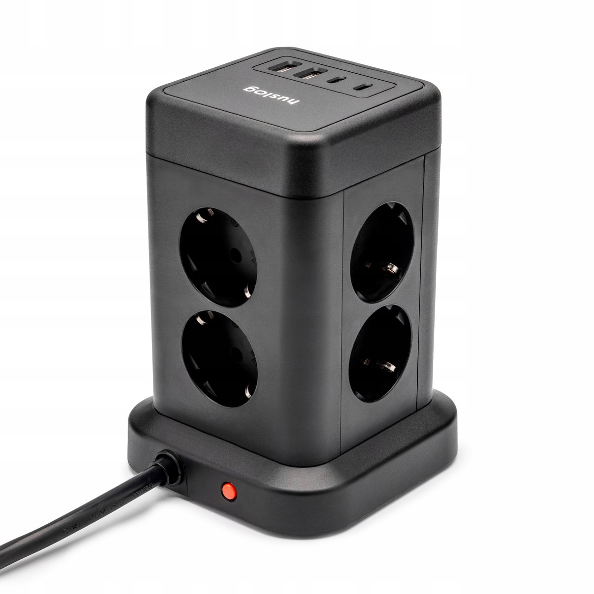 Do przedłużacza można podłączyć do ośmiu urządzeń zasilanych z sieci elektrycznej oraz cztery urządzenia z zasilaniem USB (2 x USB, 2 x USB-C).