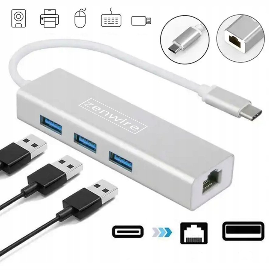 ✅Przejściówka USB-C Ethernet HUB 3xUSB 3.0 RJ45 Adapter LAN 2.0 Konwerter