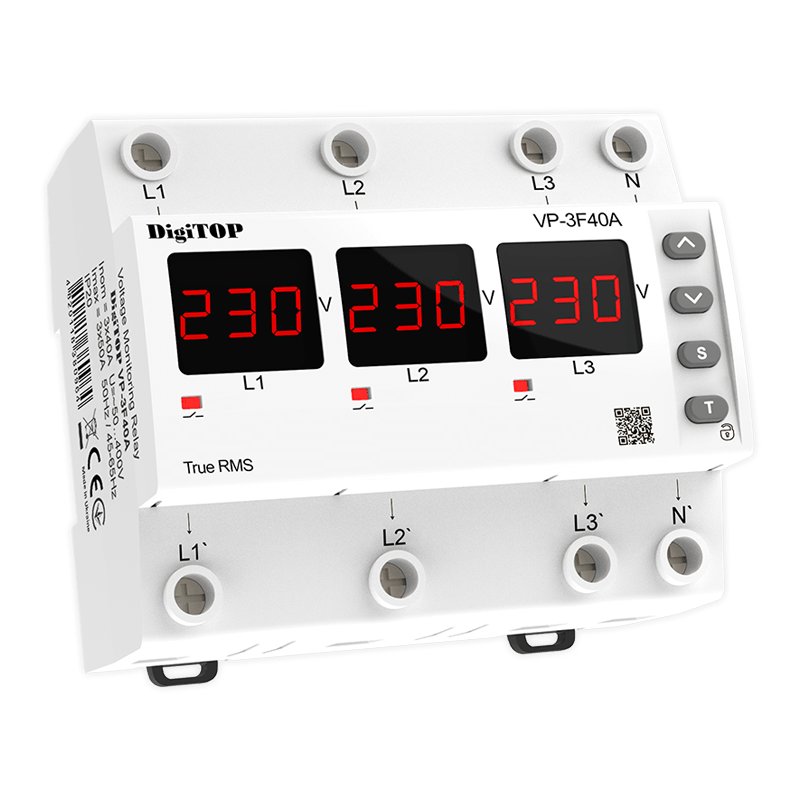 Przekaźnik napięciowy trójfazowy DigiTOP VP-3F40A przeznaczony jest do ochrony odbiorników jednofazowych lub trójfazowych przed wahaniami napięcia, asymetrią faz, utratą faz, kontrolą kolejności faz. Urządzenie zapobiega awariom i przedłuża żywotność urządzeń elektrycznych. Z możliwością wyboru trybu pracy jako trójfazowy lub trzy niezależne przekaźniki jednofazowe.