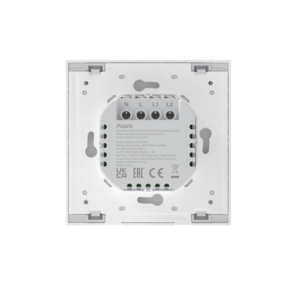 Zmodernizowany inteligentny wyłącznik Aqara Wall Double Switch H1 jest montowany w miejsce standardowego okrągłego gniazda. Wersja wyłącznika "z przewodem neutralnym" wymaga podłączenia do przewodu neutralnego i oferuje rozszerzoną funkcjonalność: statystykę zużycia energii elektrycznej, pamięć stanu oraz zabezpieczenie przed przeciążeniem.