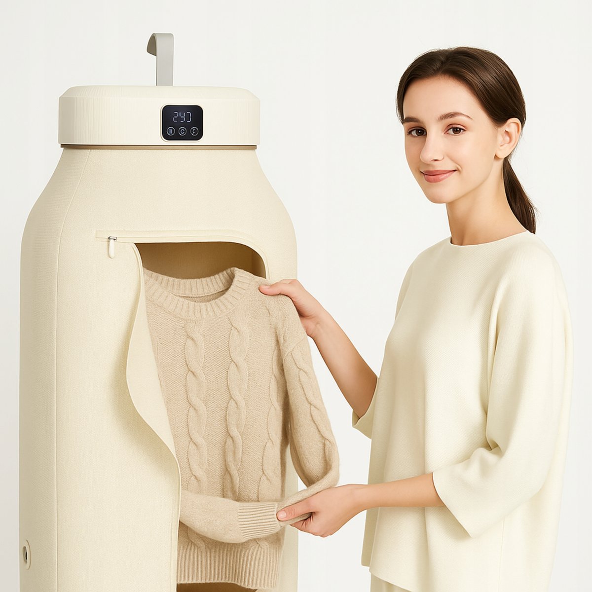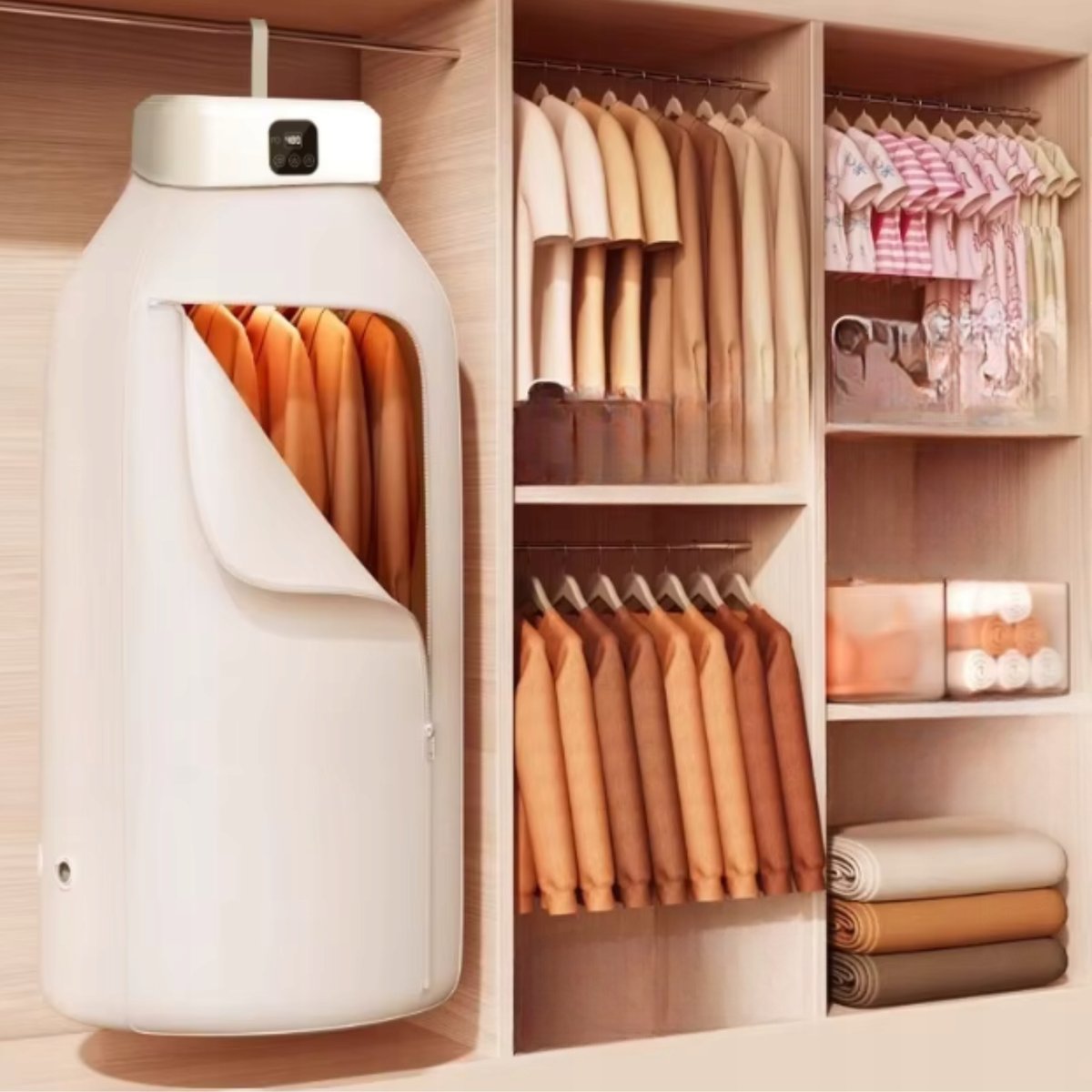 Przenośna suszarka turystyczna sprawia, że koszulki, swetry, a nawet zimowe kurtki schną w zamkniętej, chroniącej przed kurzem komorze z cyrkulacją gorącego powietrza 360°.