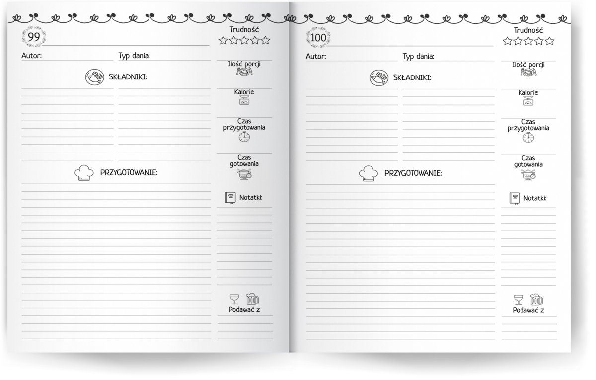 Przepiśnik Ulubione Przepisy to zeszyt na przepisy z pięknie zaprojektowaną okładką. W środku znajdziesz miejsce na zapisywanie Twoich ulubionych przepisów, pomysłów na potrawy oraz przelicznik ...