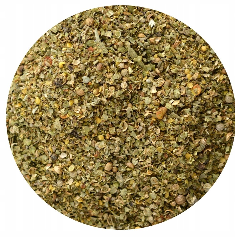 pieprz tłuczony, kolendra, majeranek, czosnek, liście laurowe mielone, ziele angielskie mielone, chili grys. Alergeny: gorczyca