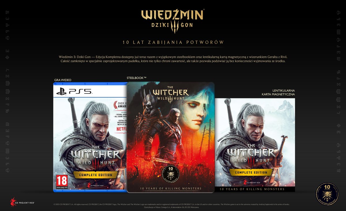 Edycja na 10-lecie gry Wiedźmin 3 Dziki Gon zawiera pełną wersję gry w Edycji Kompletnej (PlayStation 5, Xbox Series X) lub Edycji Gry Roku (PC), lentikularną kartę magnetyczną oraz wyjątkowy, jubileuszowy steelbook.