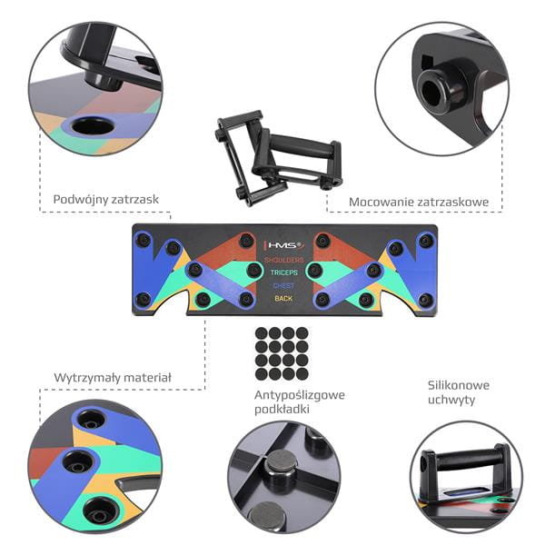pu10 multi marki hms, to innowacyjna i wielofunkcyjna deska, służąca do wykonywania ugięć ramion w podporze przodem, czyli tzw. Pompek.przy jej użyciu, możliwe jest wykonanie treningu, niemalże całej
