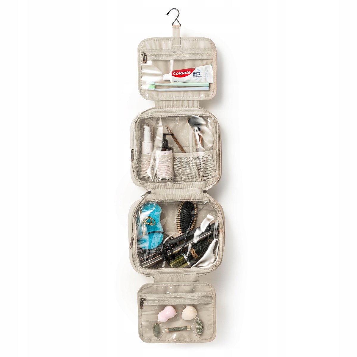 ➡️ Po rozłożeniu kosmetyczka posiada cztery niezależne strefy organizacyjne. Pierwsza część została wyposażona w praktyczny haczyk, umożliwiający zawieszenie kosmetyczki w dowolnym miejscu – np. na drzwiach łazienki czy wieszaku – oraz kieszeń na drobne akcesoria. Kolejna komora zawiera przegrody przystosowane do przechowywania kosmetyków w pozycji pionowej, co zapobiega ich rozlaniu podczas transportu. Trzecia część to pojemna kieszeń mieszcząca większe przedmioty, jak szczotki do włosów czy butelki z balsamem. Ostatnia strefa służy do przechowywania drobiazgów i również została wyposażona w zamek.