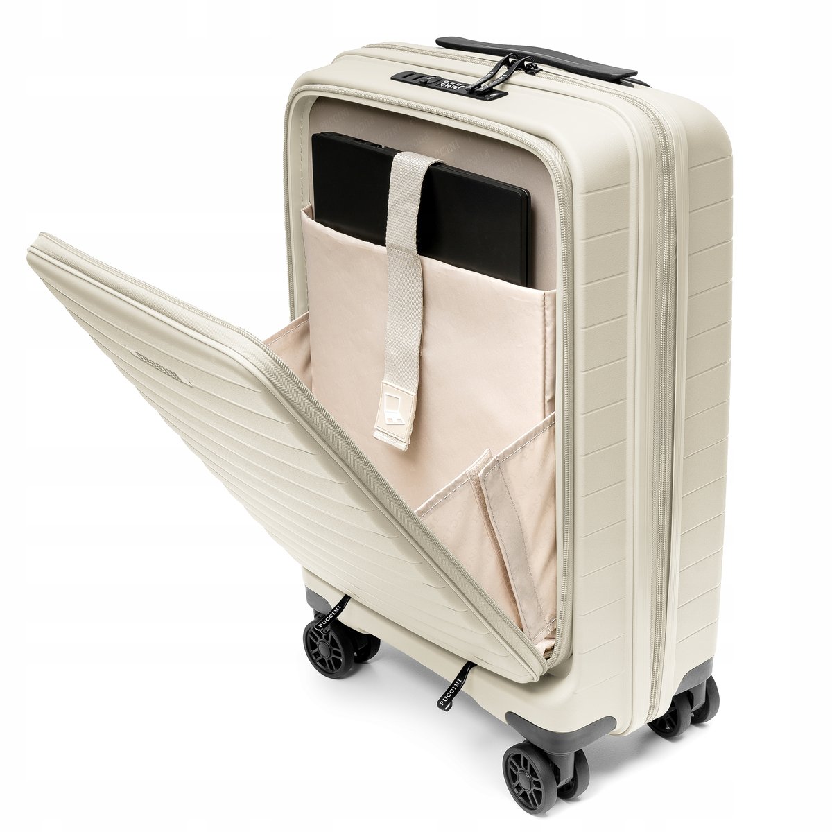 ▶️ Model wyróżnia się obecnością zewnętrznej kieszeni zamykanej na suwak, wyposażonej w dedykowane miejsce na laptopa lub tablet. Rozwiązanie to, dodatkowo zabezpieczone rzepami, pozwala na szybki dostęp do najpotrzebniejszych przedmiotów bez konieczności otwierania całej walizki. Wnętrze podzielone zostało na dwie funkcjonalne komory – jedną zamykaną klapą z dużą kieszenią siateczkową na zamek, drugą z regulowanymi pasami, które stabilizują zawartość i zapobiegają jej przemieszczaniu.
