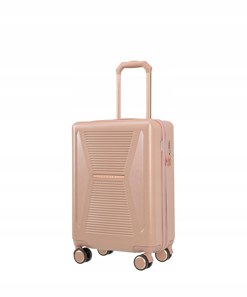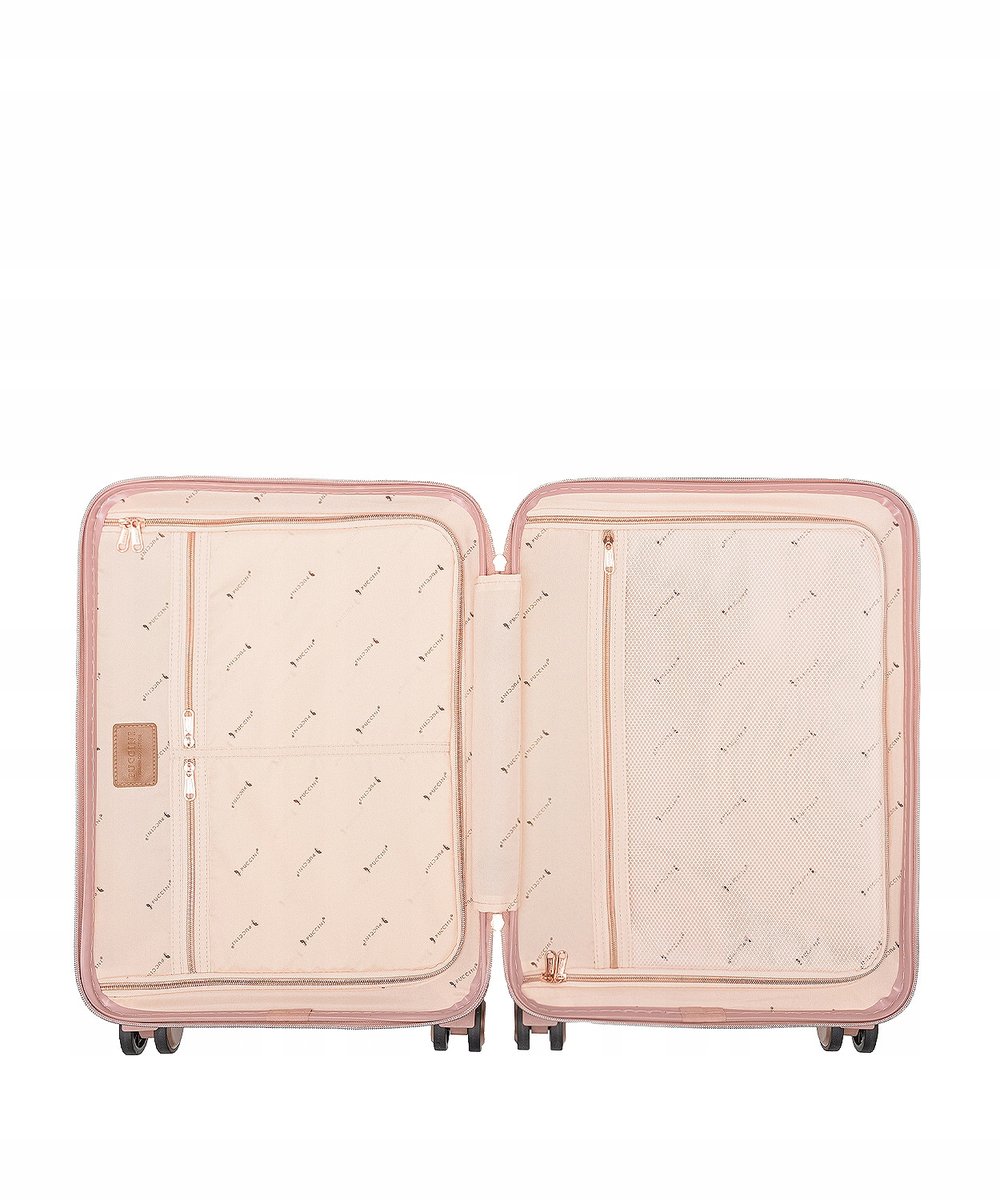 ⏩ Walizki emanują niepowtarzalnym designem, charakteryzującym się subtelnie żebrowaną powierzchnią w kształcie klepsydry na przodzie, co dodaje jej wyjątkowego uroku. Wszystkie metalowe detale zostały starannie wykończone podkreślając ekskluzywny wygląd walizki.