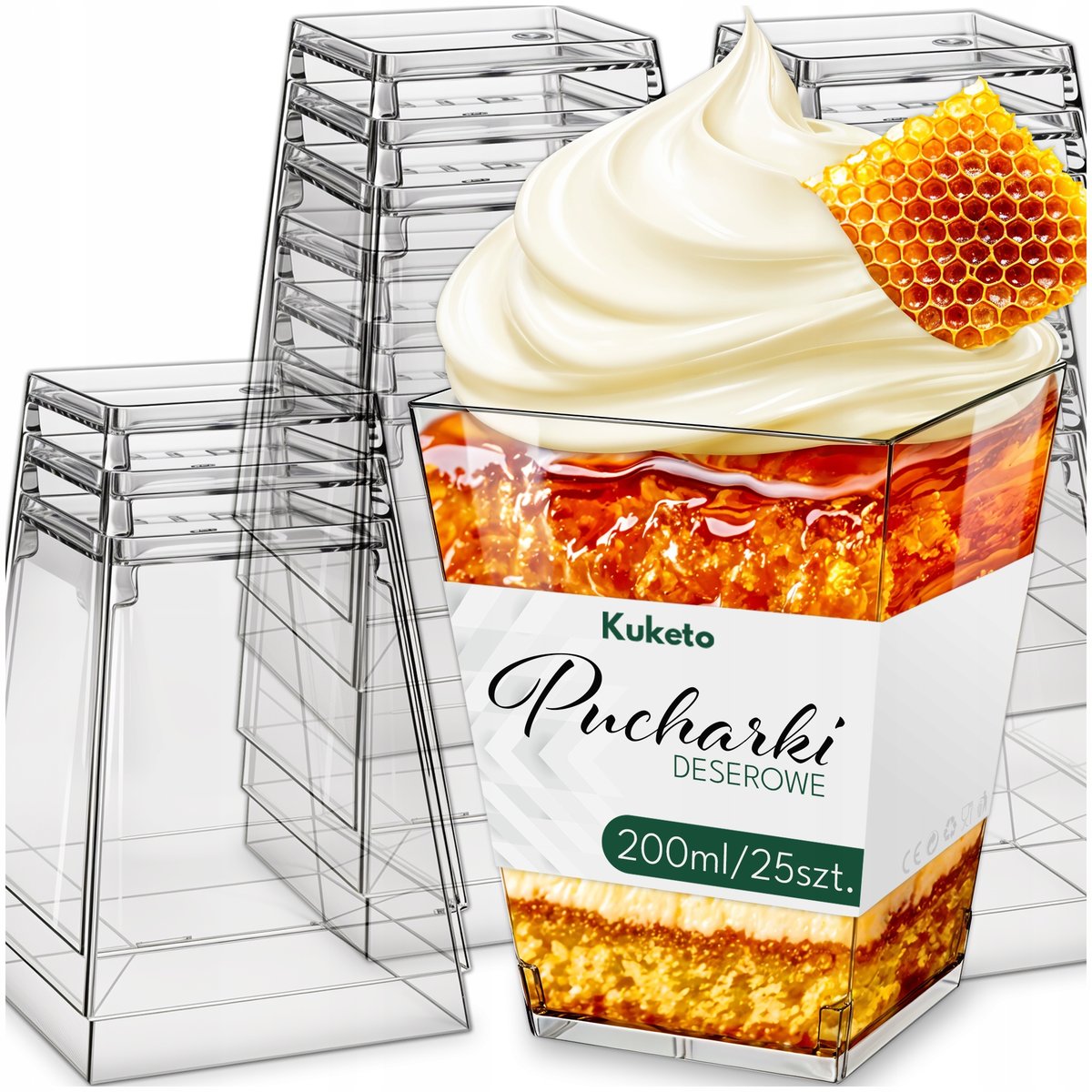☑️ Doskonałe rozwiązanie do serwowania efektownych deserów i przekąsek. Ich nowoczesna forma przyciąga wzrok i sprawia, że każda warstwa wygląda jeszcze bardziej apetycznie. W zestawie znajduje się aż 25 sztuk, co pozwala na sprawne przygotowanie poczęstunku dla większej liczby gości.