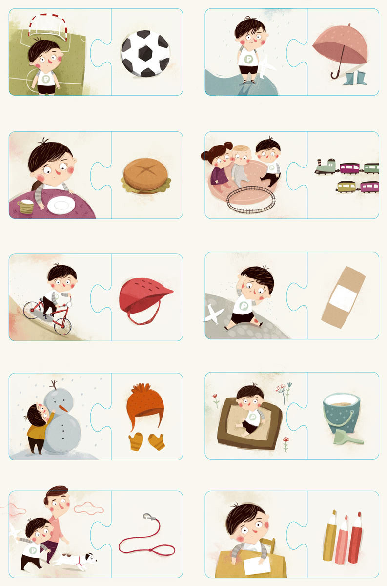 Puzzle dwuelementowe skierowane do dzieci od 2 lat. Na obrazkach jest Pucio w sytuacjach, w których… czegoś brakuje. Dziecko powinno przyjrzeć się obrazkowi głównemu, zastanowić się, czego brakuje, i dopasować do obrazka drugi element, na którym widnieje właściwy obiekt.