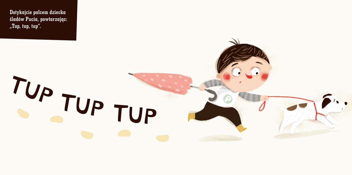 Pucio zaprasza do wspólnej zabawy! Oglądajcie ilustracje i dotykajcie ich, odczytując zapisane na nich dźwięki. Powtarzajcie razem z dzieckiem gesty wykonywane przez Pucia (możecie pomóc maluchowi, kierując jego ręką). Wyraźnie intonujcie i zabarwiajcie emocjonalnie swoje wypowiedzi, bo to zwraca uwagę dziecka i zachęca je do naśladowania.