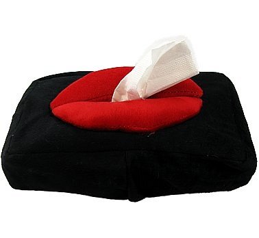 pluszowe, mięciutkie pudełko na chusteczki kształt: usta kolorystyka: czarny, czerwony pod spodem pudełka znajduje się gumka, dzięki czemu rozmiar pokrowca jest uniwersalny