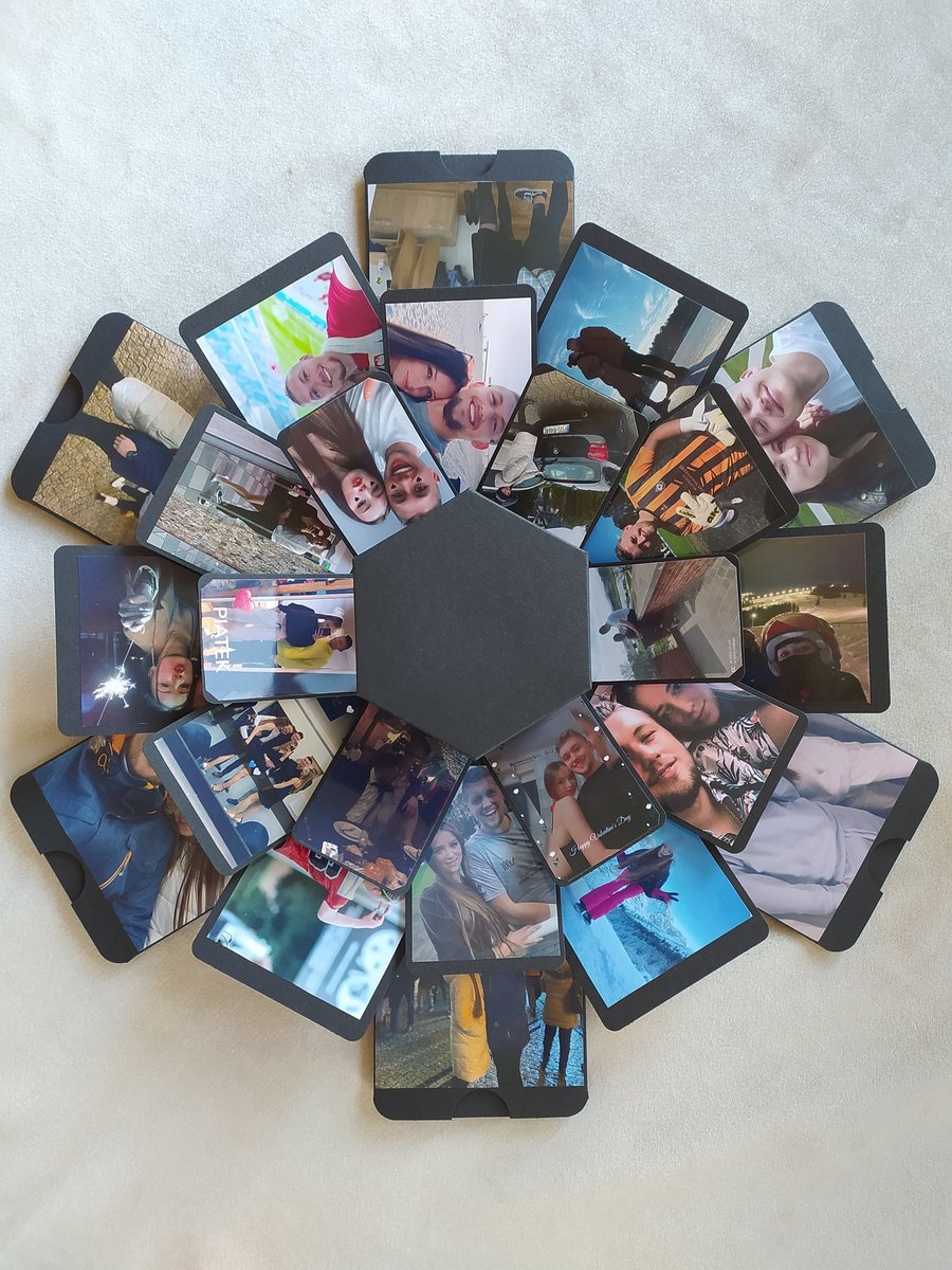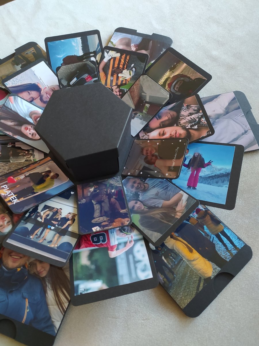 ➡️ To ręcznie robione pudełko posiada 24 miejsca na zdjęcia. Jeśli chcesz, możesz umieścić więcej fotografii np. na bokach. Na samej górze znajduje się małe pudełko upominkowe, możesz włożyć tam jakąś małą rzecz - pierścionek, zegarek lub słodycze.