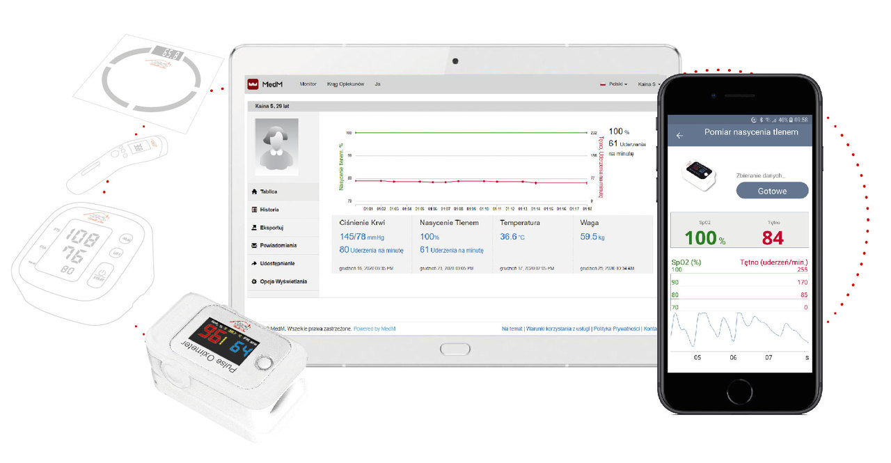 Dla Państwa bezpieczeństwa i wygody wprowadziliśmy możliwość prezentacji wyników pomiaru nasycenia krwi tlenem (a także ciśnienia krwi i tętna, temperatury ciała, oraz masy ciała i jego części składowych) w bardzo wygodnej formie. Stworzyliśmy witrynę internetową MedM Health. Każdy wynik pomiarów tych parametrów życiowych zostanie po dokonaniu pomiaru AUTOMATYCZNIE ZAPISANY W TEJ WITRYNIE. Wyniki możesz następnie obejrzeć a także udostępnić wybranym osobom BEZ KONIECZNOŚCI WYSYŁANIA ICH ZA POMOCĄ WIADOMOŚCI E-MAIL.
