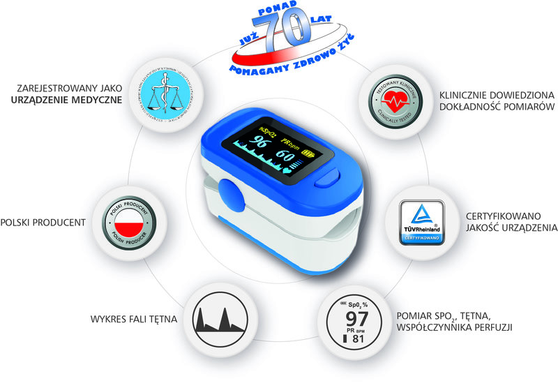 Saturacja: zakres 70-100% SpO2, dokładność +/- 2%