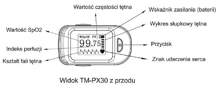 Pulsoksymetr TM-PX30 wskazany jest do nieinwazyjnego monitorowania funkcjonalnego nasycenia krwi tętniczej tlenem (SPO2) oraz tętna mierzonego za pomocą sensora SpO2. Może być użyty jako urządzenie do wyrywkowej kontroli w domu, klinikach i szpitalach.