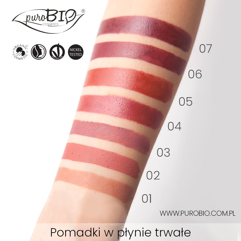 Trwała pomadka do ust w płynie. Wygodną aplikację zapewnia specjalnie wyprofilowana szpatułka. Dzięki zastosowaniu organicznego wosku carnauba pomadki wykazują silne działanie natłuszczające i zmiękczające oraz hamują wysuszanie skóry. Roślinne składniki takie jak wyciąg kakaowca oraz olej jojoba dbają o odpowiednie nawilżenie i regenerację naskórka. Wystarczy jedna aplikacja aby uzyskać głębię trwałej i pożądanej kolorystyki. Aby nadać efekt połysku można wykończyć makijaż ust specjalistycznym nabłyszczaczem do pomadek od PuroBIO.