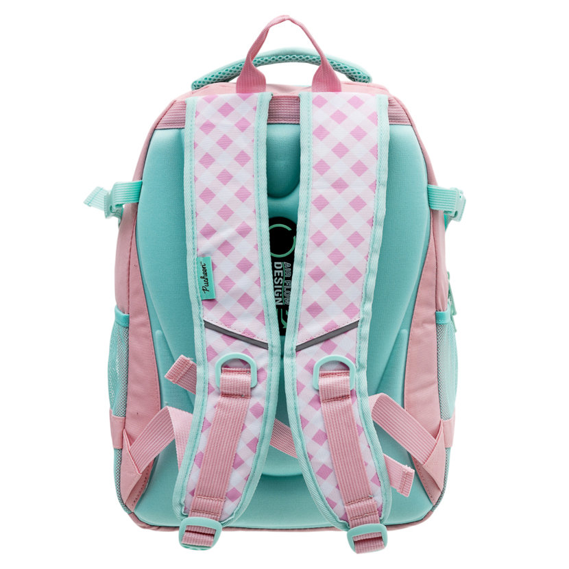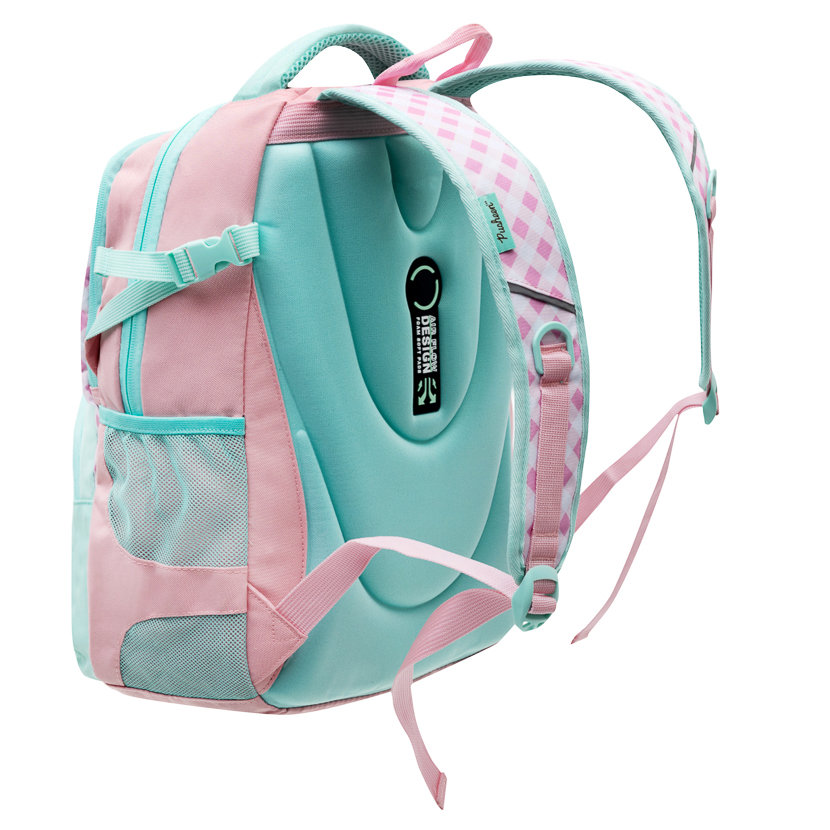 Plecak zachwyca pastelową kolorystyką, łącząc różowe, miętowe i białe akcenty w harmonijną całość.