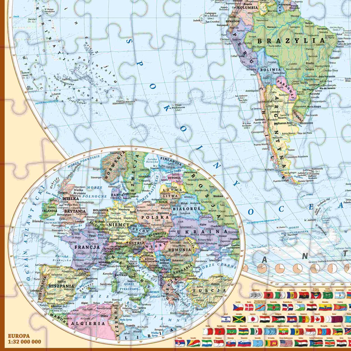 ➡️Czytelne kontury, zaznaczone miasta i stolice umożliwiają naukę w przyjemny sposób. Dodatkowo, w dolnej części układanki umieściliśmy flagi państw wraz z ich nazwami.