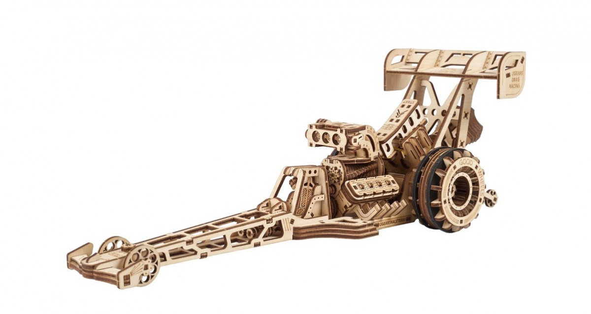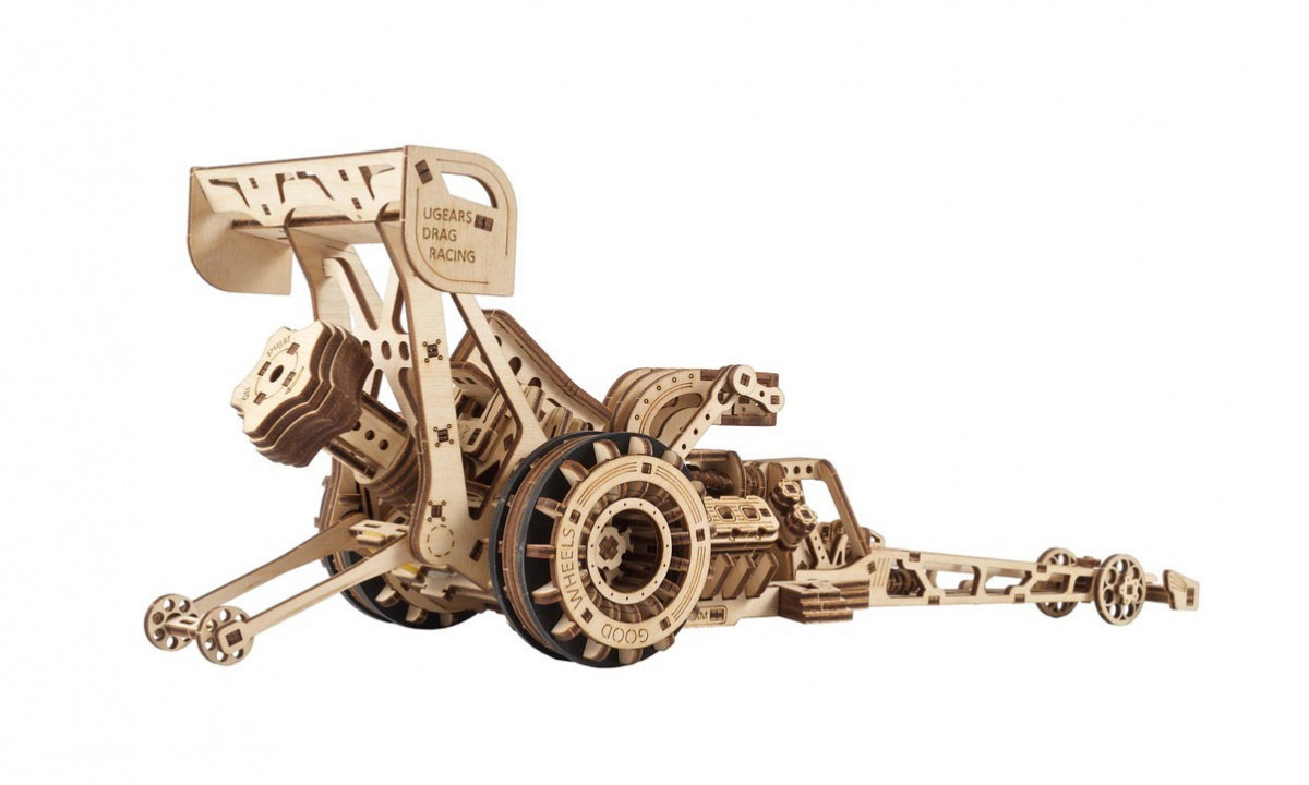 Co to jest Dragster? To pojazd używany w wyścigach na krótkich dystansach osiągający prędkość ponad 500 km/h. Maszyny te biorą udział w wyścigach typu Drag Racing, w których dwa pojazdy w jak najkrótszym czasie przy starcie od zera pokonać mają prosty odcinek drogi lub toru. Dlaczego o tym mówimy? Otóż chcemy Wam przedstawić zdecydowanie najszybszy model z całej serii Ugears czyli Auto Top Fuel Dragster!
