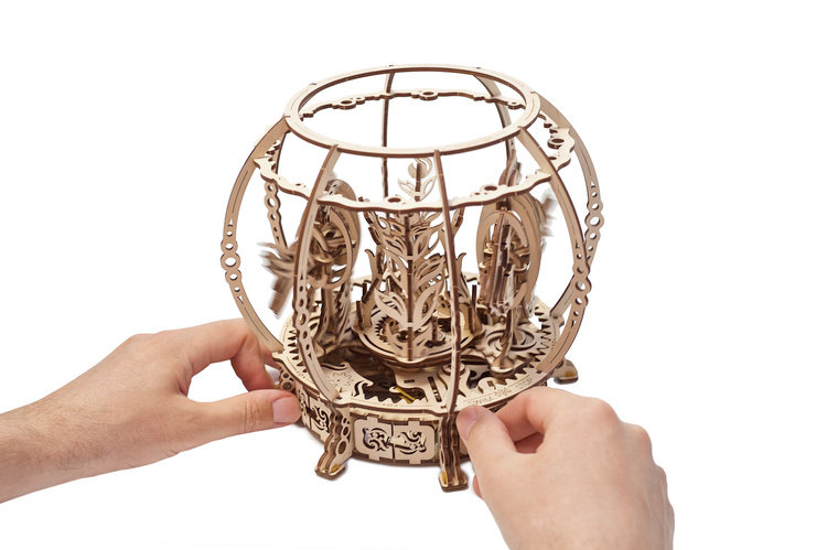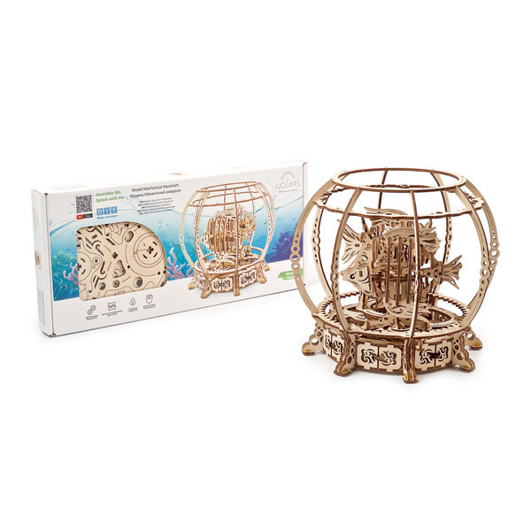 Model akwarium jest nie tylko doskonałym dodatkiem do katalogu Ugears, ale także posiada unikalne mechaniczne działanie. Ryby i algi obracają się jednocześnie i równolegle, z różnymi prędkościami i w różnych kierunkach, symulując płynny, falujący rytm podwodnego życia roślin i zwierząt.