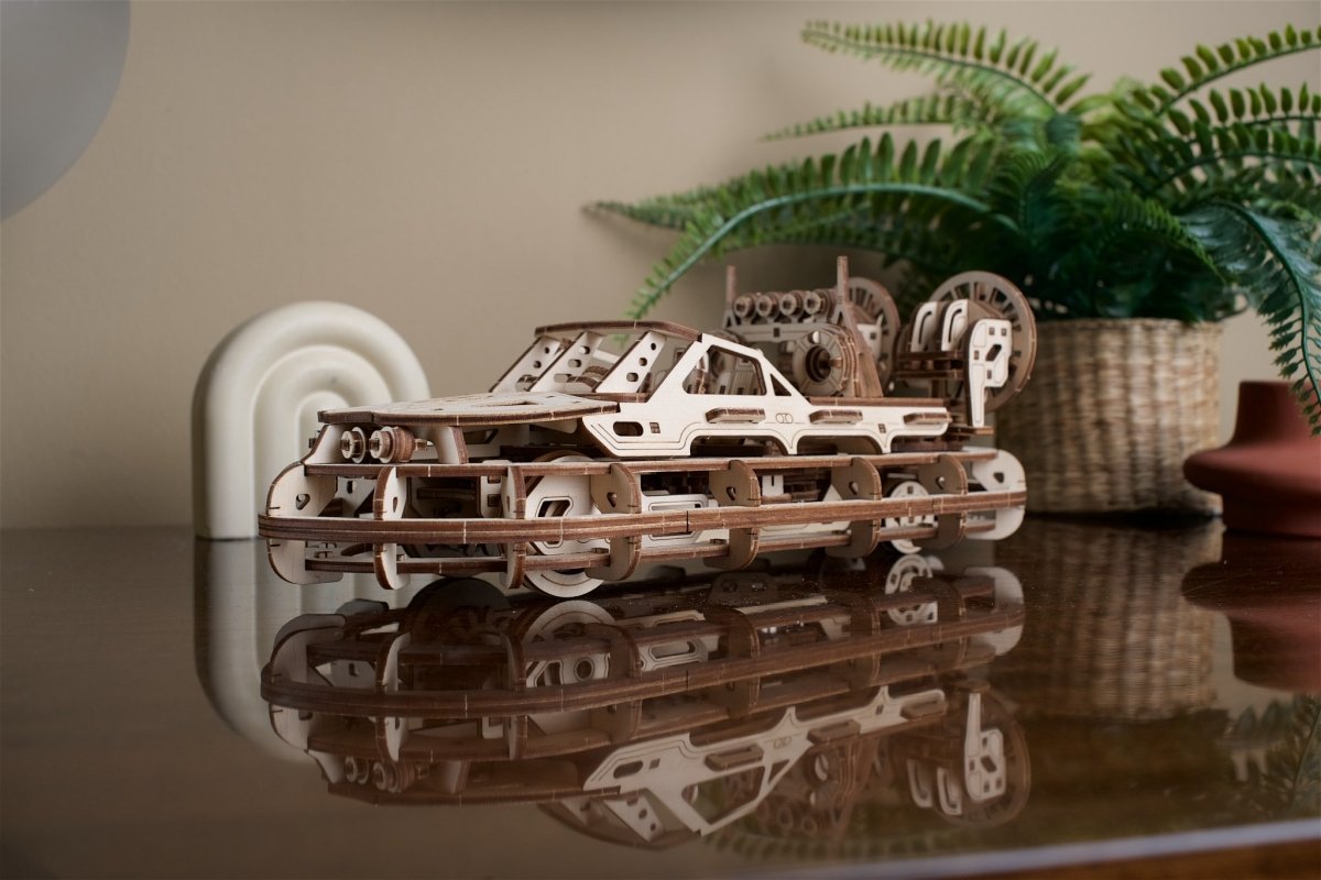 Poduszkowiec ratunkowy od UGEARS to model z drewna eleganckiego, dwuśmigłowego poduszkowca przeznaczonego do jazdy w każdym terenie w skali 1:24. Ten model z drewna do samodzielnego montażu jest napędzany silnikiem sprężynowym, z kluczem do nakręcania znajdującym się na spodzie pojazdu. Przełącznik Start/Stop pozwala nakręcić silnik, dokonując dziesięciu obrotów zgodnie z ruchem wskazówek zegara, a następnie uruchomić silnik, gdy oba śmigła zaczynają się obracać, a łódź wykonuje eleganckie, zaprogramowane skręty w lewo i prawo w odległość 3 metrów, imitując delikatny kołyszący ruch prawdziwego poduszkowca.