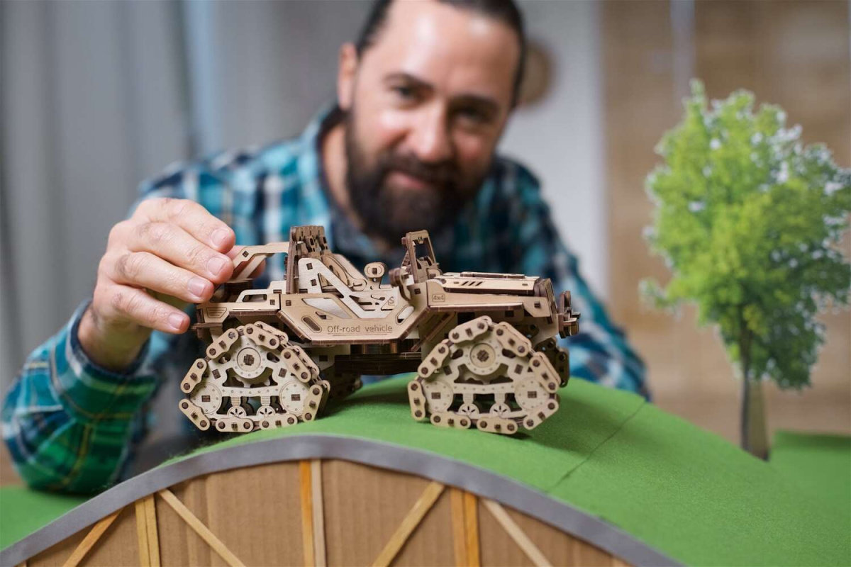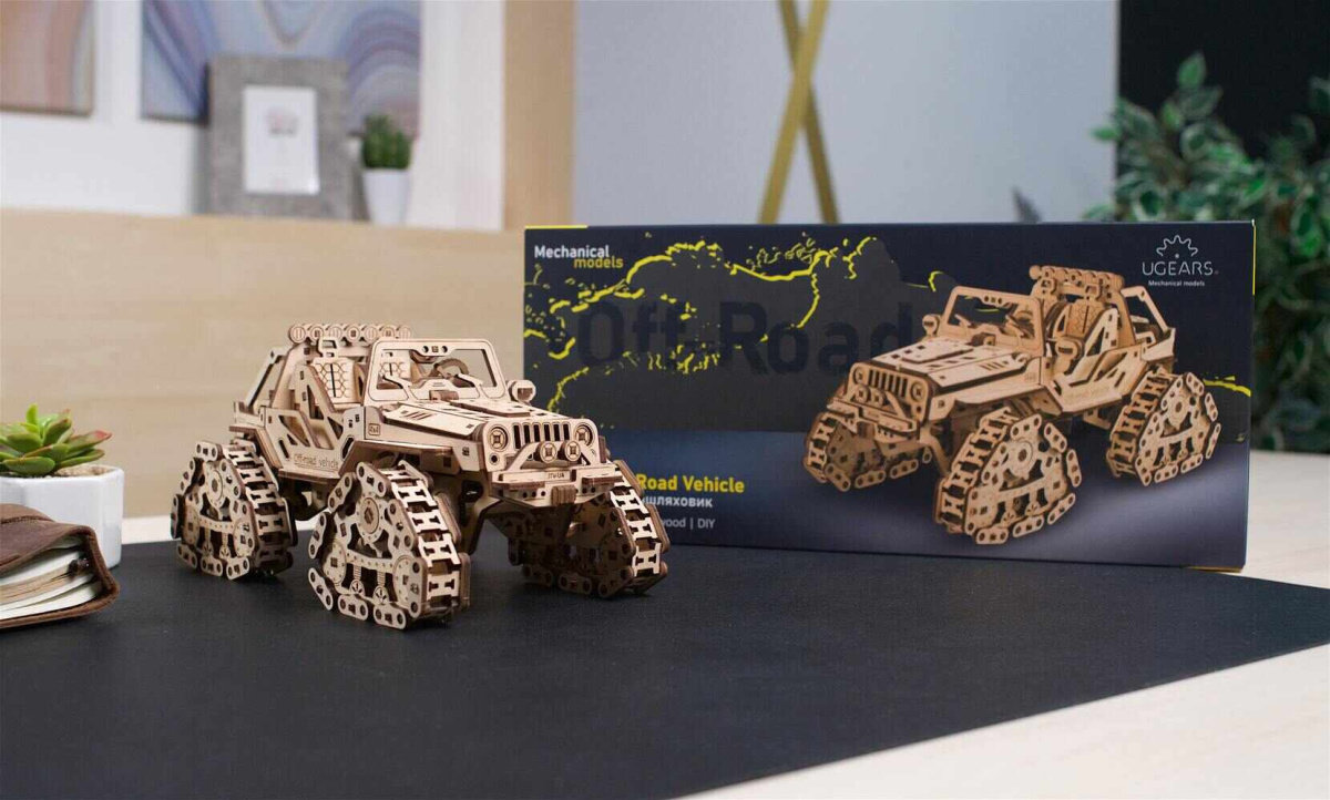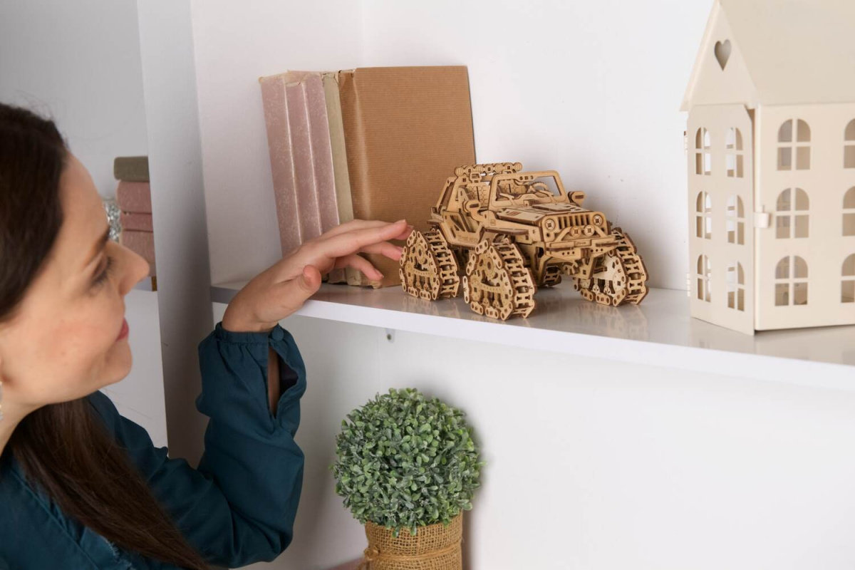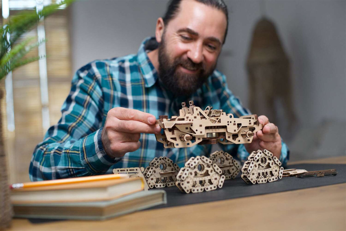 Gąsienicowy Pojazd Terenowy - zbuduj go od podstaw! Ten zaawansowany zestaw puzzli 3D, to nie lada wyzwanie zarówno dla doświadczonych entuzjastów składania drewnianych modeli, jak i dla osób, które