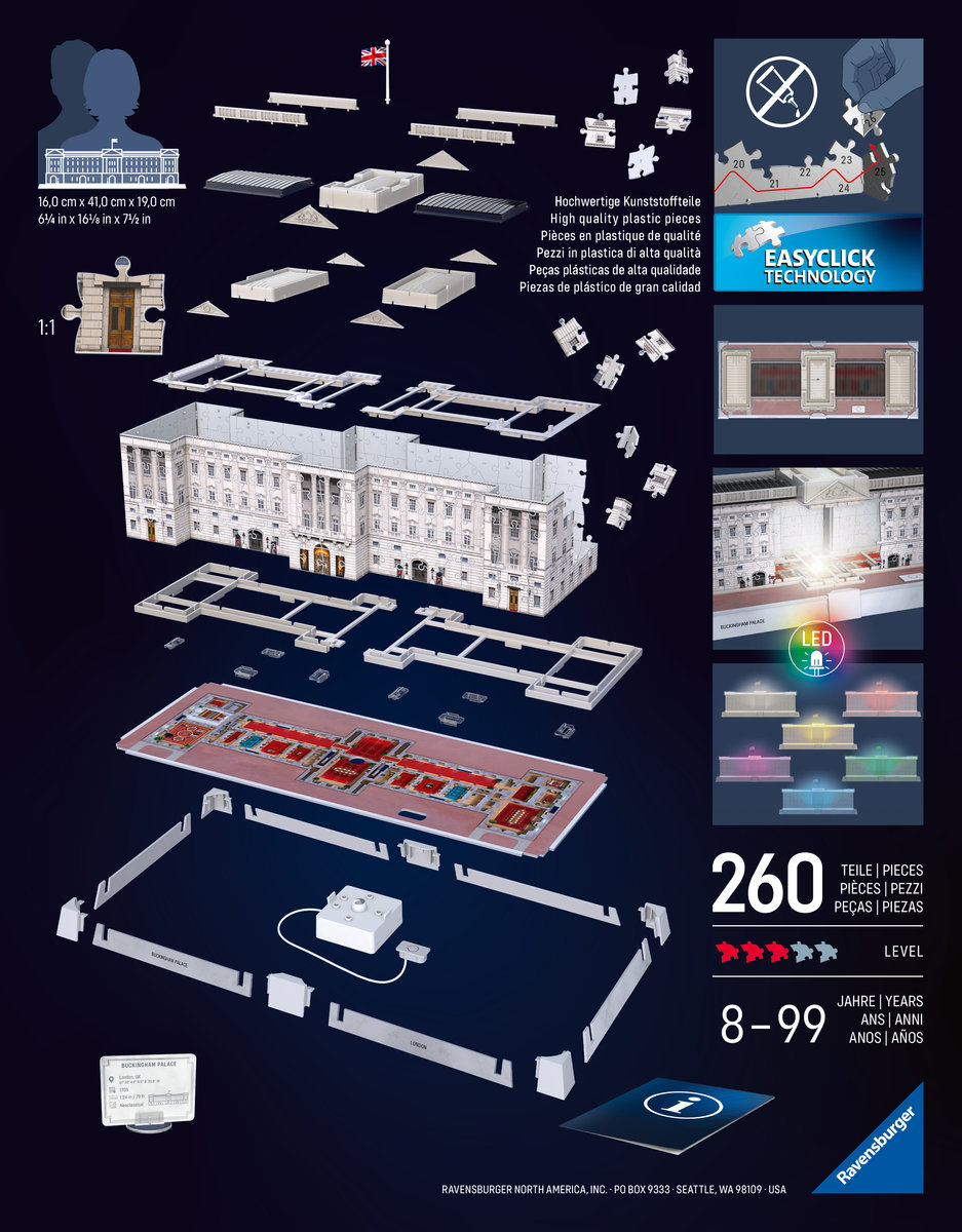 Zamieszkaj jak król Anglii – zbuduj własny pałac i pozwól mu zabłysnąć! Początkowo wzniesiony w 1703 roku jako Buckingham House, a przekształcony w pałac w latach 20. XIX wieku, budynek ten należy dziś do najważniejszych atrakcji turystycznych Londynu. Dzięki temu modelowi z puzzli 3D brytyjska rodzina królewska zawita także do Twojego domu – a dzięki efektownemu podświetleniu zapewni prawdziwie królewskie chwile wieczorem i nocą!