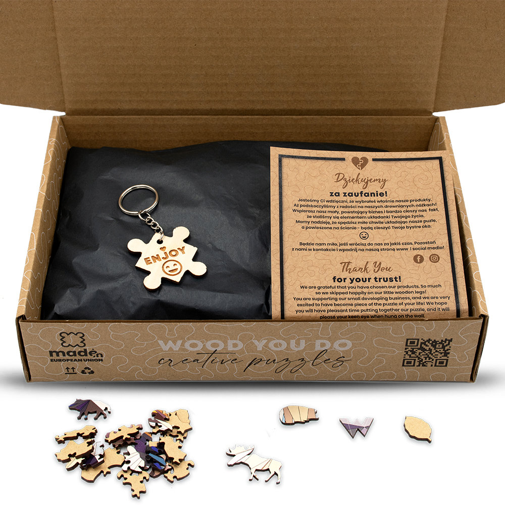 Każdy element układanki jest unikalnym sztosem! Drugiego takiego samego nie znajdziesz, choćbyś ze świeczką szukał. Choć też nie do końca polecamy, bo drewno raczej łatwopalnym tworzywem jest. A wolimy Cię niespłoniętego :) A i tak obleje Cię ciepło, na widok różnego rodzaju kształtów zwierząt i roślin jakie kryją się w każdym z naszych wzorów.