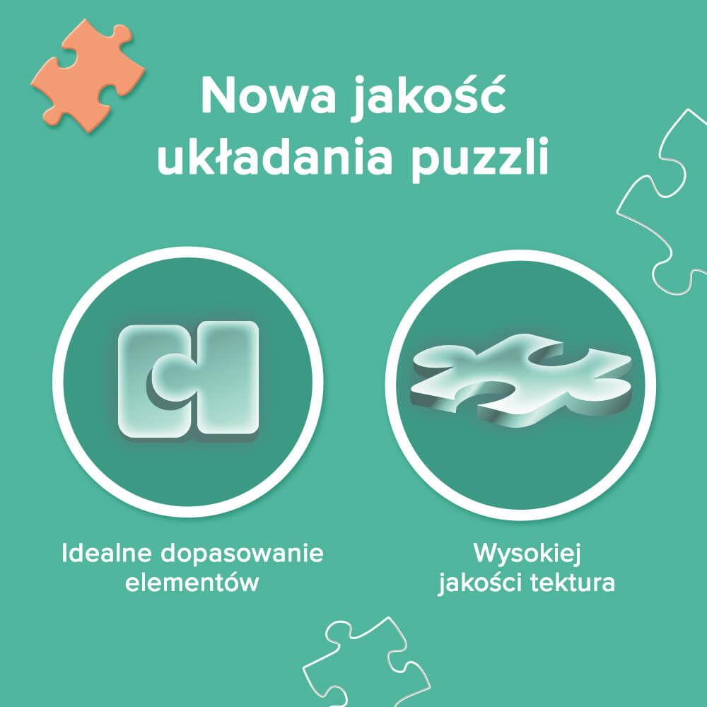 Odkryj wysoką jakość wykonania puzzli Premium Plus Quality. Co wyróżnia tę serię spośród pozostałych? Grubsza tektura puzzlowa, specjalny kształt puzzli oraz niezafoliowane pudełko, zabezpieczone wyłącznie naklejkami. Seria posiada też certyfikat FSC, co oznacza, że do produkcji puzzli zostały wykorzystane materiały pochodzące z lasów zarządzanych w sposób odpowiedzialny.