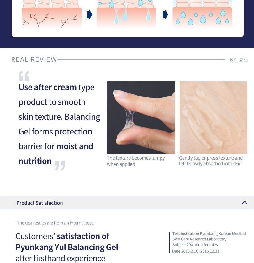 Pyunkang Yul - Balancing Gel - nawilżający żel do twarzy o miodopodobnej konsystencji. Produkt zawiera ekstrakt z korzenia traganka błoniastego, który wykazuje silne działanie przeciwzapalne, a także regeneruje i odżywia suchą i podrażnioną skórę. Zawarty olej z jojoba, który chroni przed czynnikami zewnętrznymi takimi jak wiatr, mróz, klimatyzowane pomieszczenia oraz zapobiega odparowywaniu wilgoci z naskórka. Żel posiada dość gęstą konsystencję, po wchłonięciu pozostawia skórę nawilżoną i ukojoną. Może być stosowany zarówno w porannej, jak i wieczornej pielęgnacji.