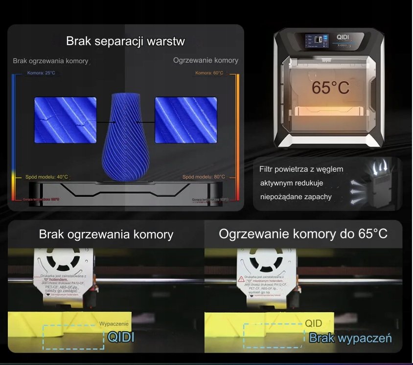 Dzięki wyższej temperaturze w podgrzewanej komorze, nasza drukarka umożliwia drukowanie różnorodnych materiałów. Równocześnie, podgrzewana komora zapewnia równomierne tworzenie części, eliminując wewnętrzne naprężenia.