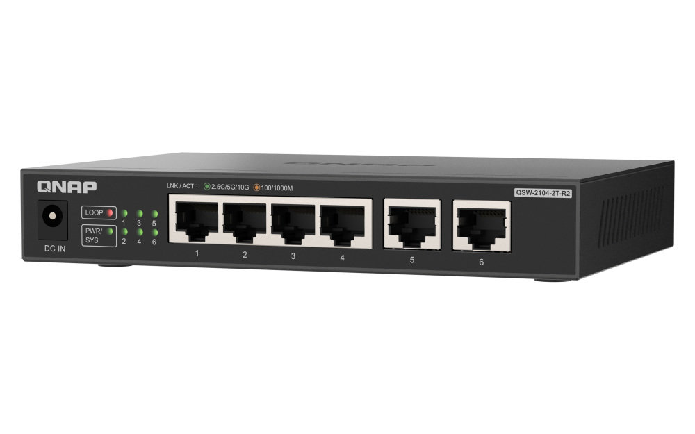 Qnap QSW-2104-2T-R2 to 6-portowy niezarządzalny przełącznik sieciowy, oferujący 2 porty 10GbE BASE-T RJ45 oraz 4 porty 2.5GbE RJ45. Dzięki temu umożliwia elastyczne i wydajne zarządzanie siecią w ...