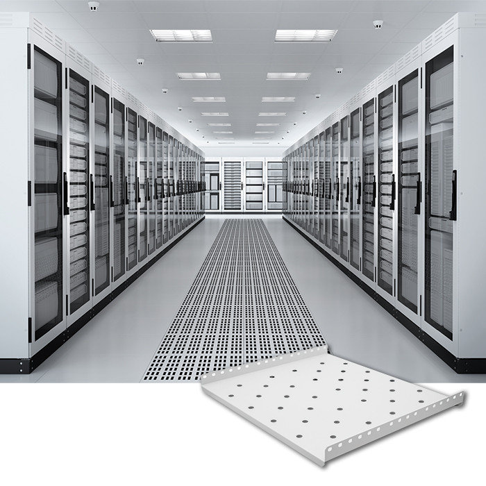 Półka do instalacji w szafie Rack'owej została wykonana z wysokiej jakości stali walcowanej na zimno. Dzięki temu, że blacha jest perforowana, zapewnia ona dostęp świeżego powietrza do urządzenia i pozwala na odprowadzanie tego nagrzanego, co zmniejsza ryzyko usterek i utraty wydajności systemu.