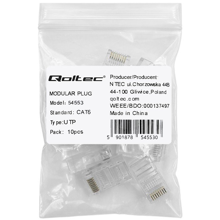 | Nazwa: | Qoltec Wtyk złącze modularne RJ45 CAT6 UTP Pozłacane styki 10 sztuk |