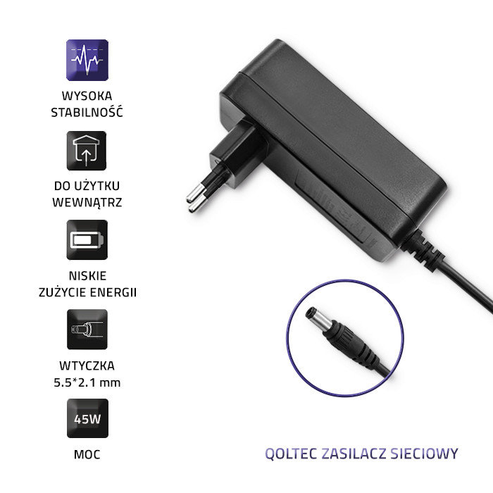 | Nazwa: | Qoltec Zasilacz Wtyczkowy 45W 15V 3A 5.5*2.1 |
