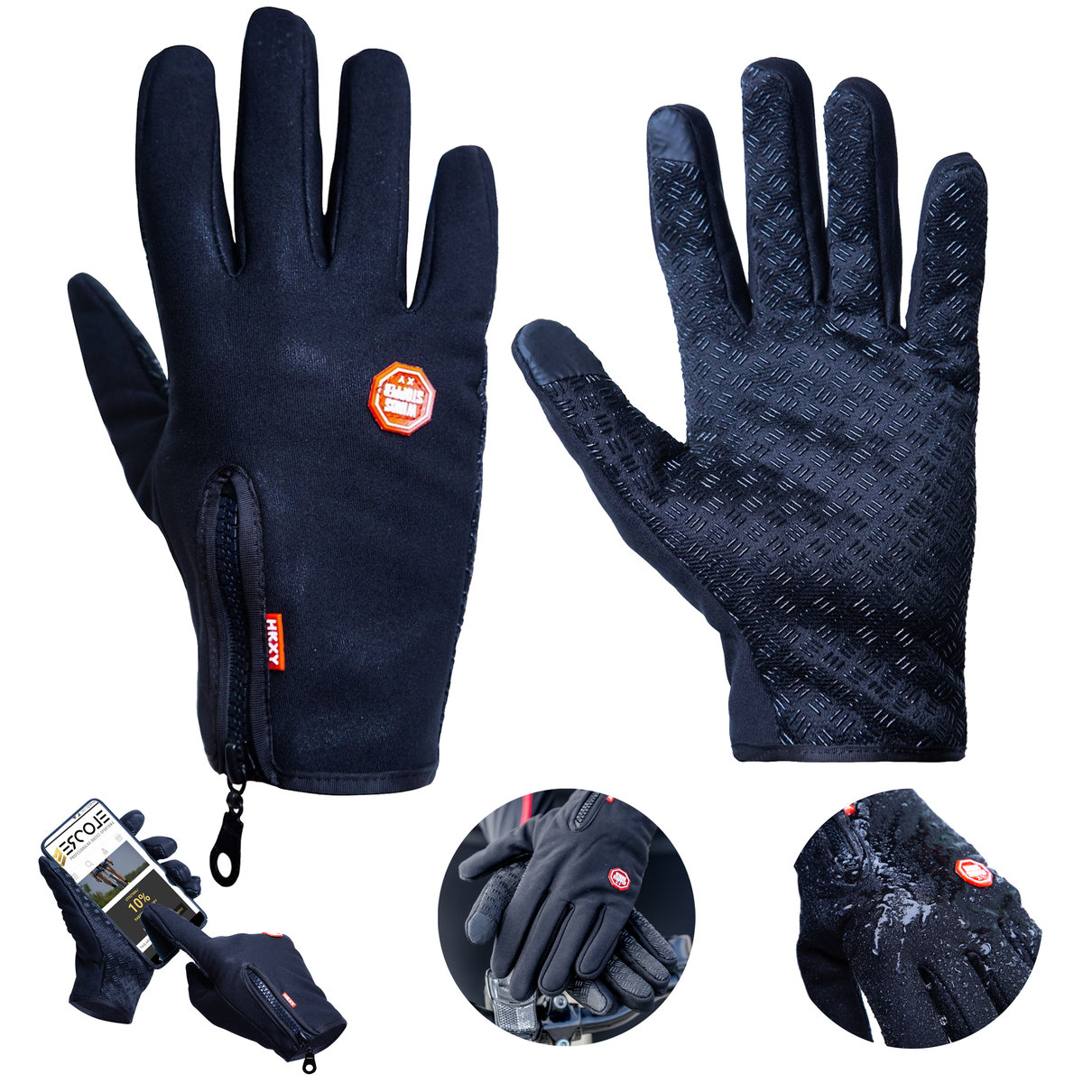 - Wodoodporność (klasa wodoodporności IPX 2) – sprawia, że rękawiczki zapewnią ochronę w przypadku mżawki lub krótkiego, lekkiego deszczu