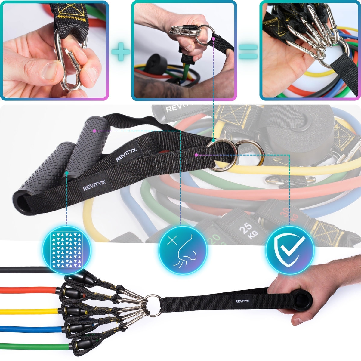 Trwałe i solidne gumowe uchwyty do gum do ćwiczeń POWER BANDS oraz innych tego typu gum do ćwiczeń wraz z karabińczykami