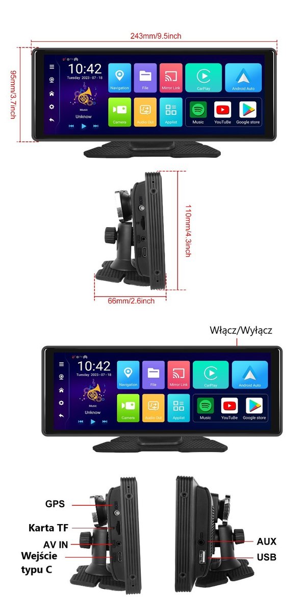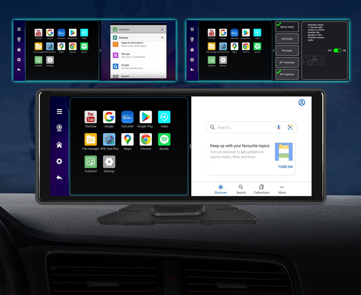 Zestaw zawiera 10,26-calowy ekran do samochodu, który można zamontować na kokpicie za pomocą taśmy 3M lub śrub. Dotykowy ekran IPS LCD o wysokiej rozdzielczości (1600x600 px) zapewnia doskonałe kąty widzenia (około 150 stopni w poziomie), co sprawia, że idealnie nadaje się do większych pojazdów, takich jak busy, vany czy autokary. Ekran można przenosić między różnymi samochodami i ma funkcję regulacji kąta nachylenia.