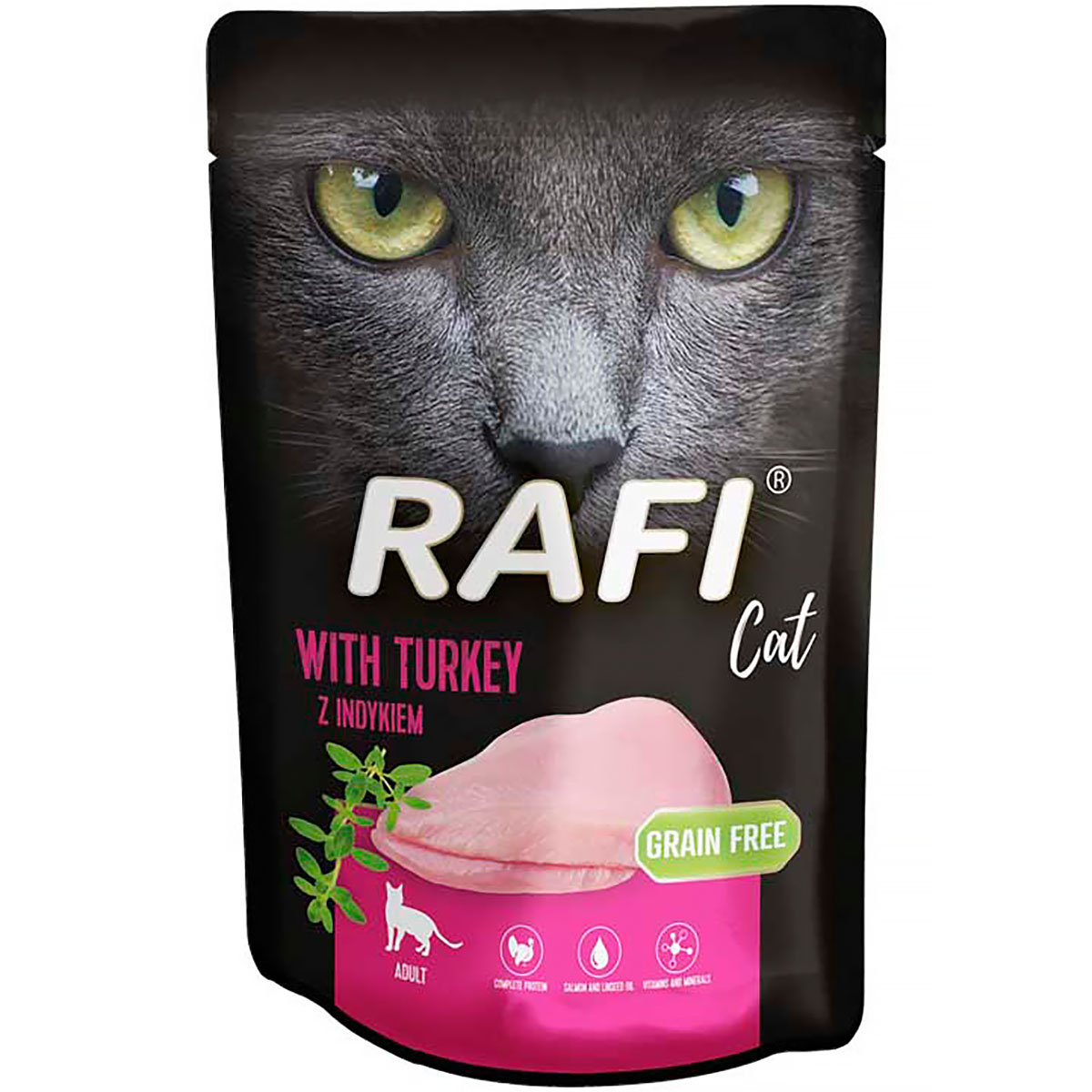 Mokra karma dla kota Rafi Cat Adult z indykiem 100 g Odpowiednia konsystencja posiłku wpływa na jego atrakcyjność dla kota.Mokra karma z indykiem w uwielbianej przez koty wilgotnej postaci, ...