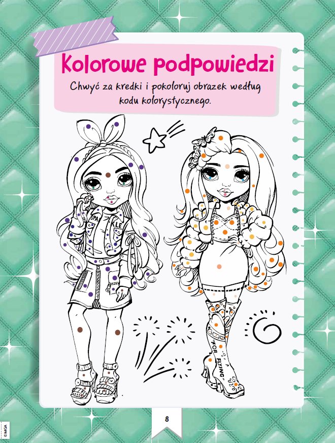 Koloruj, baw się i odbijaj tatuaże Studentki Rainbow High Academy zapraszają do wspólnej zabawy. Koloruj obrazki, uzupełniaj zadania, a na koniec zrób sobie wyjątkowe tatuaże. W tej kolorowej książce