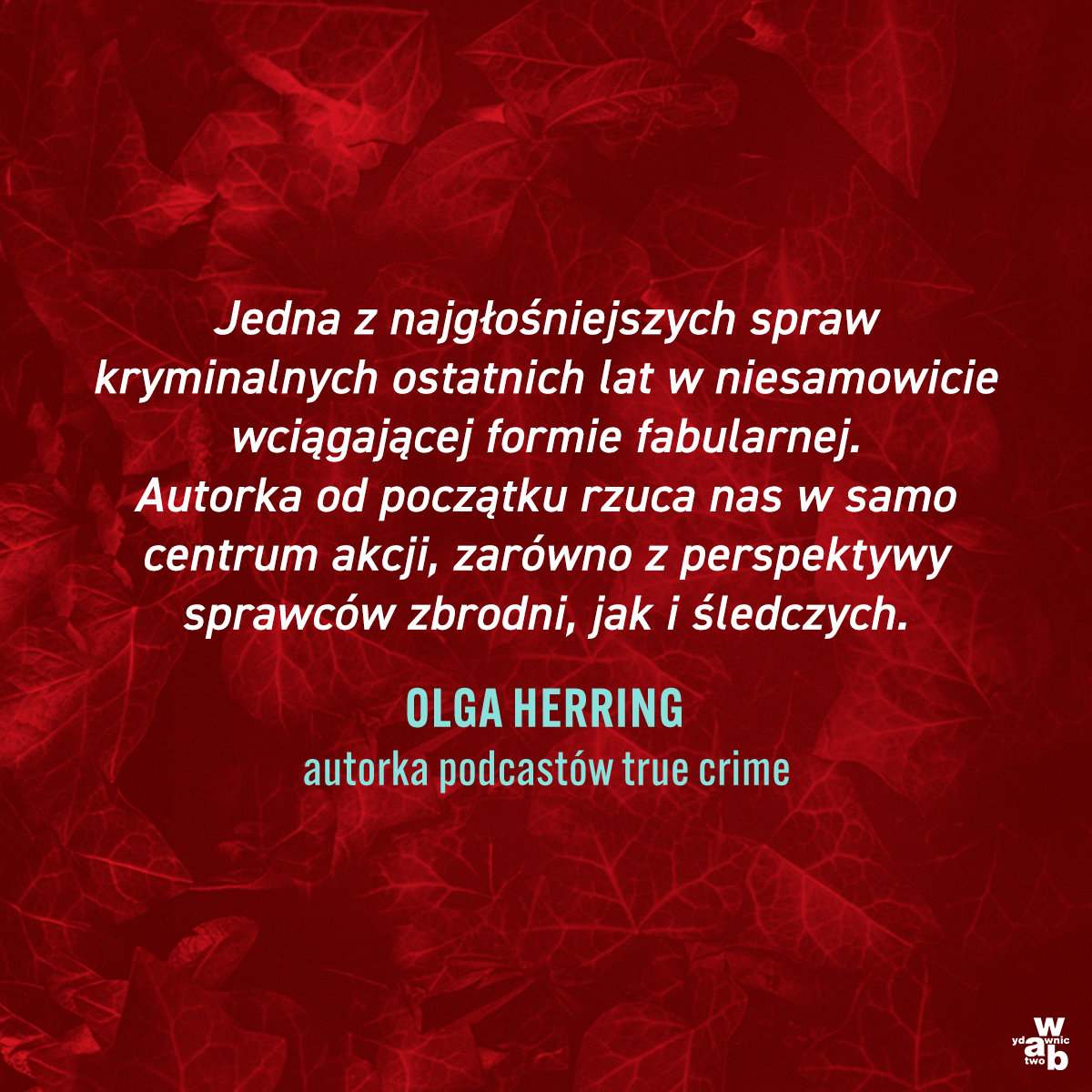 "Jedna z najgłośniejszych spraw kryminalnych ostatnich lat w niesamowicie wciągającej formie fabularnej. Autorka od początku rzuca nas w samo centrum akcji, zarówno z perspektywy sprawców zbrodni, jak i śledczych."