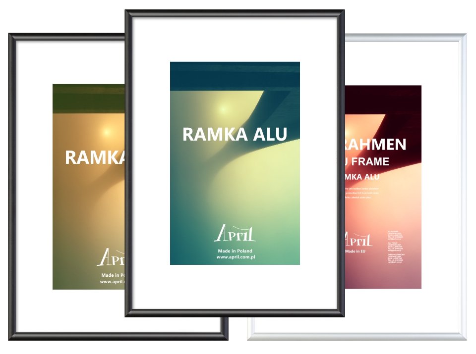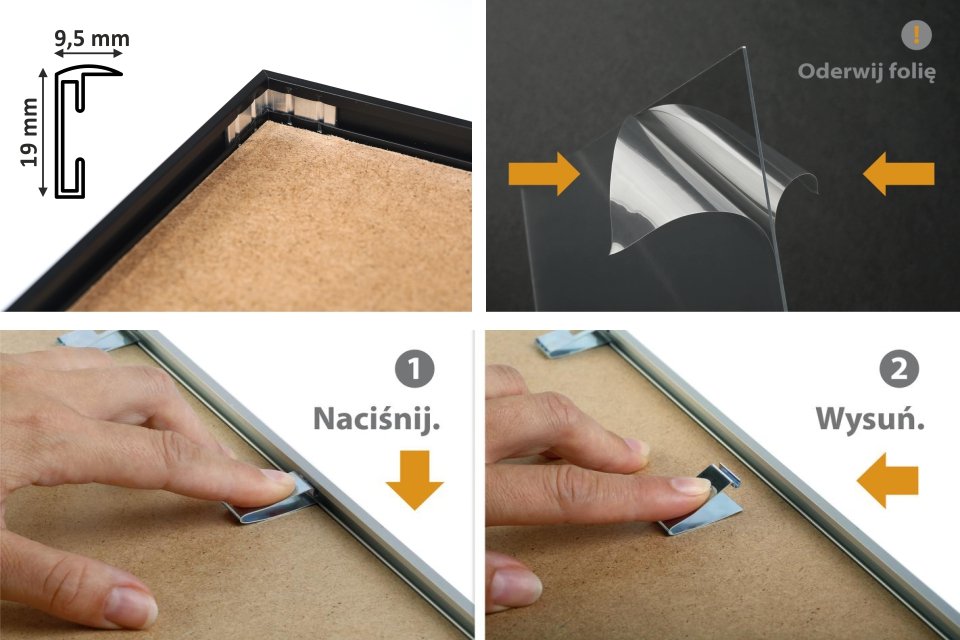 Ramka wyłącznie wisząca. Budowa: ramka aluminiowa (nierozbieralna), polistyren bezbarwny (plexi) dwustronnie zabezpieczona folią ochronną, płyta HDF. Aluminiowy profil o wymiarach 19 x 9 mm. Klipsy wysuwane, służą również do zawieszania.